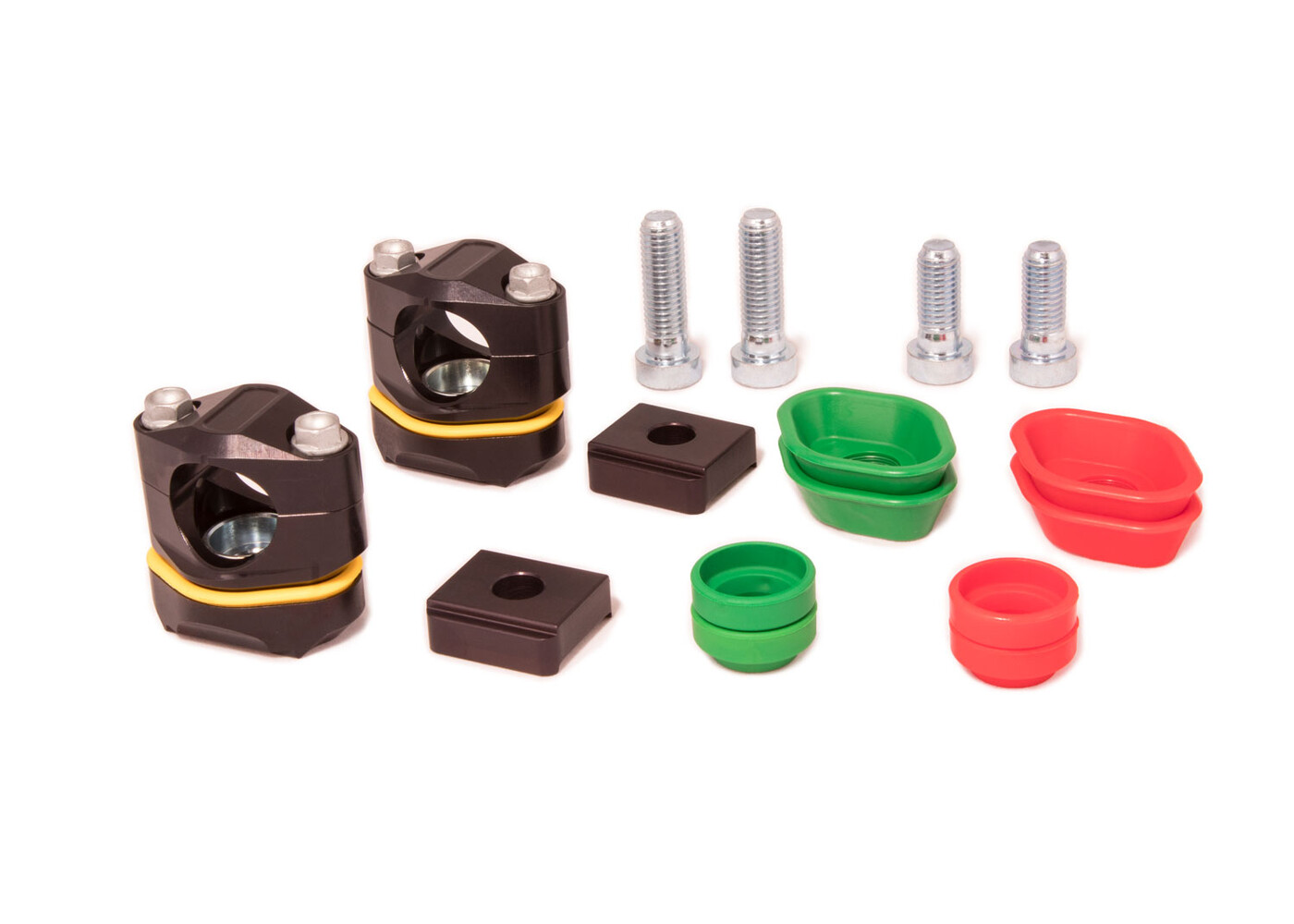 Like the PHDS, the FlexFix is a system mounted on elastomers that absorbs vibration from the motor and chassis. This system also dampens the forces acting on the handlebars in both horizontal and vertical directions, while maintaining handlebar precision. By mounting on the triple clamp, there are many possibilities for handlebar adjustment and adaptability to the needs of each rider.  The low overall height of the FlexFix makes it possible to mount the handlebar 6mm lower than the M12 PHDS. Through exchangeable elastomers, the hardness can be individually adjusted (soft - green, medium - yellow (standard), hard - red). Available for 28.6mm and 36mm handlebars.