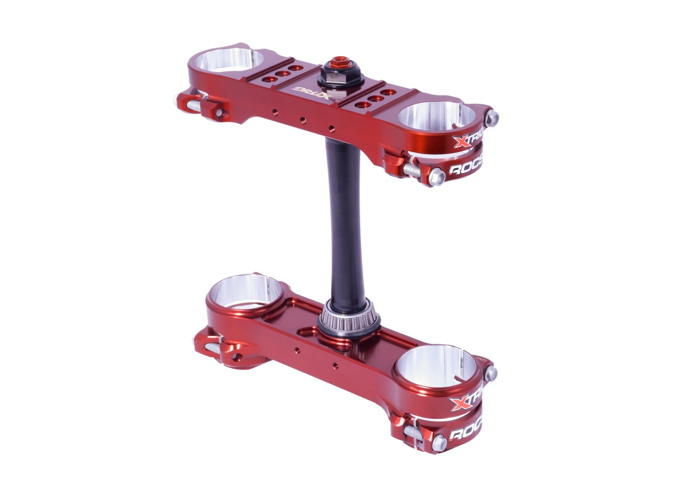 The Revolutionary Opposing Clamp System, ROCS for short, was one of the most spectacular and elaborate developments by XTRIG in recent years. The advantages of this system compared to a conventional triple clamp are the lower deformation of the fork stanchions in the clamping area, which has a noticeable effect on the response of the fork but also the design with the two opposing clamps, which ensures more security against twisting of the fork by the self-locking effect. Another advantage is the fact that the clamping screws do not influence each other, and thus, a more precise tightening torque can be achieved. Since there is no material between the clamping screws, ROCS - triple clamps also have a lower weight in comparison.